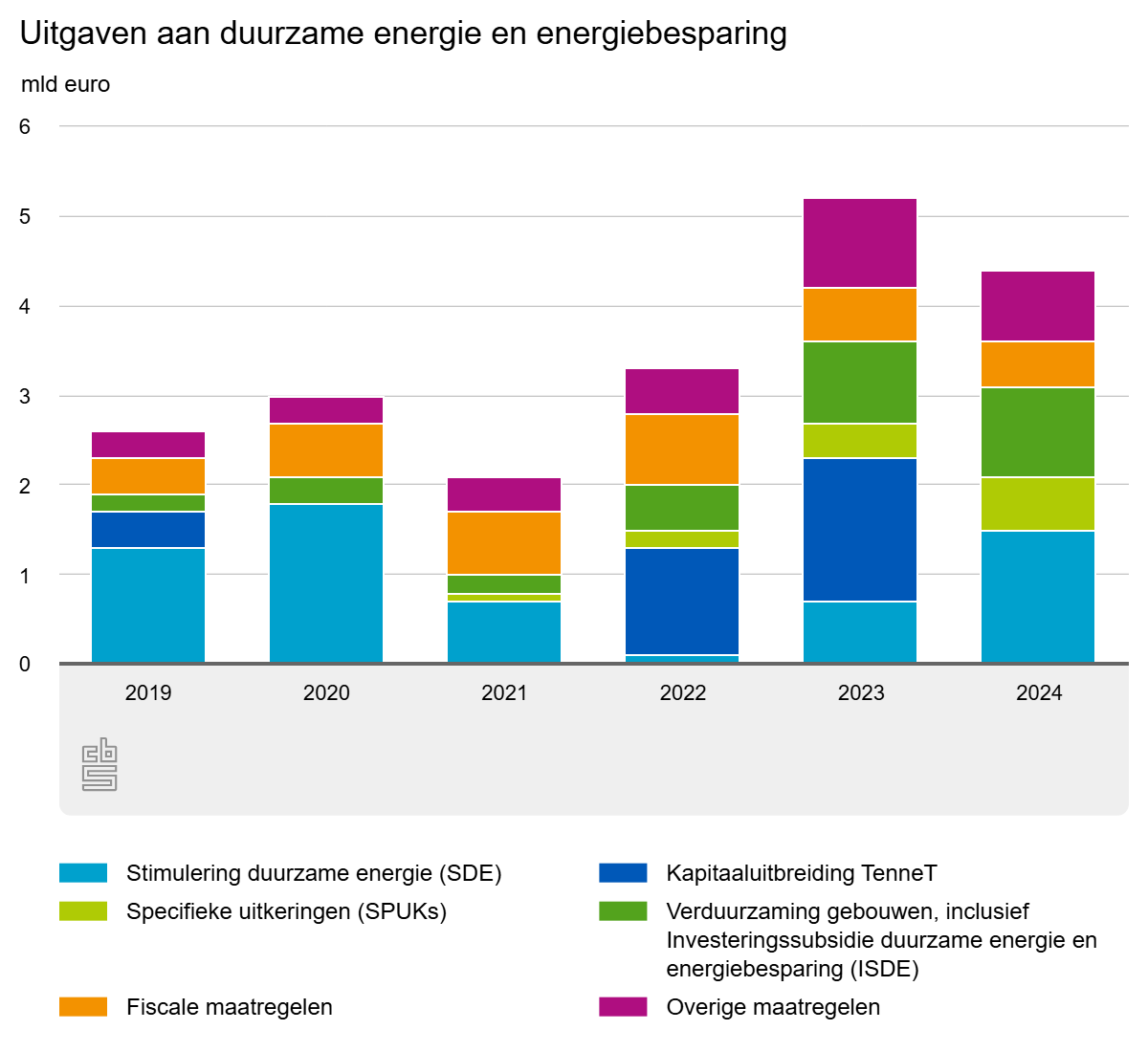 In 2024 waren de uitgaven van de overheid aan de energietransitie 4,4 miljard. Deze uitgaven bestaan grotendeels uit subsidies en deels uit kortingen op belastingen op energieverbruik. De SDE is een van de belangrijkste uitgaven, maar de precieze hoogte hiervan wisselt per jaar.
