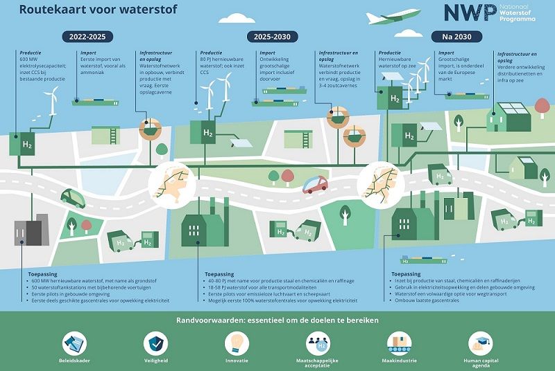 Op de Dag van het Klimaatakkoord heeft het Nationaal Waterstof Programma (NWP) de Routekaart Waterstof overhandigd aan Rob Jetten, minister voor Klimaat en Energie. De Routekaart geeft inzicht in de Nederlandse waterstofambities en doelen richting 2030 en daarna en beschrijft welke acties nodig zijn. Volgens het NWP moet Nederland zijn groene waterstofambities verdubbelen naar 6 tot 8 gigawatt om er zeker van te zijn dat Nederland de Europese doelen voor hernieuwbare waterstof in 2030 gaat halen.