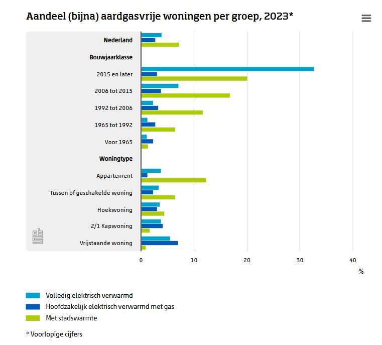Van de woningen die na 2015 gebouwd zijn, is het grootste deel elektrisch verwarmd (32,8 procent), een kleiner deel heeft een aansluiting op een warmtenet. Voor oudere woningen die (bijna) aardgasvrij zijn is dat andersom: die zijn vaker aardgasvrij door een aansluiting op een warmtenet dan door een (hybride) warmtepomp.